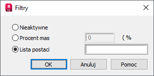 Okno dialogowe Filtry służy do określania liczby postaci branych pod uwagę podczas analizy dynamicznej konstrukcji. Okno to może być wywołane na ekran po wybraniu analizy spektralnej lub sejsmicznej i naciśnięciu klawisza Filtry w oknie dialogowym służącym do definicji parametrów wybranego typu analizy dynamicznej. Na ekranie pojawia się pokazane poniżej okno.