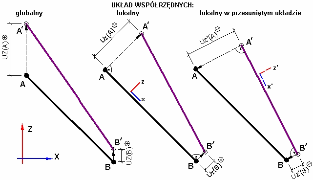 Jeżeli odsunięcie definiowane jest w globalnym układzie współrzędnych, to składowe wektora przesunięcia pręta (przekroju pręta) AA' i BB' są określane w globalnym układzie współrzędnych.
