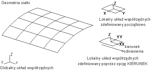 Osie X i Y są lokalnymi osiami zdefiniowanymi przy użyciu opcji Kierunek na karcie Szczegółowe. Ta opcja pozwala na określenie głównego kierunku lokalnego układu współrzędnych, który będzie używany (oś x). Wartości wielkości wynikowych dla wszystkich elementów są przeliczane do tego obróconego układu współrzędnych. Kierunek można zdefiniować poprzez podanie dowolnego wektora definiującego ‘główny’ kierunek przy wyznaczaniu wyników dla powierzchniowych elementów skończonych. Wybrany wektor jest następnie rzutowany na element, co ostatecznie definiuje położenie lokalnej osi x. Istnieje jedynie jedno ograniczenie — wektor ‘główny’ nie może być prostopadły do elementu (tzn. równoległy do lokalnej osi z elementu). Jeżeli użytkownik wybierze taki kierunek, wszystkie wyniki będą zerami.