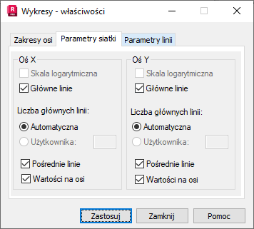 Opcje znajdujące się w tym oknie dialogowym pozwalają na określenie parametrów siatki pomocniczej dla osi X i osi Y prezentowanej na wykresach: