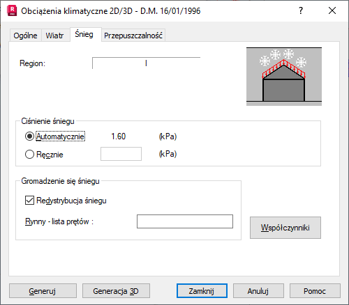 - Redystrybucja śniegu — opcja ta pozwala na generację obciążeń śniegiem z uwzględnieniem zsuwania się śniegu z nachylonych połaci dachowych, zwiewania śniegu przez wiatr oraz gromadzenia śniegu przez różne przeszkody na połaciach dachowych (rynny, naszczytniki). Standardowo obciążenia śniegiem są generowane z uwzględnieniem redystrybucji śniegu na połaciach dachowych.