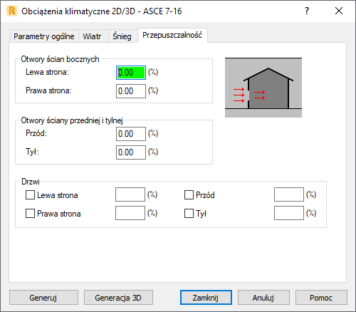 Można zdefiniować procent powierzchni otworów dla każdego z następujących elementów: lewa strona (ściana i dach), prawa strona (ściana i dach), ściana przednia i ściana tylna. Całkowita wysokość rzutowana jest brana pod uwagę podczas obliczania całkowitej powierzchni bocznej. Należy uwzględnić wspólną wartość procentową dachu i ściany dla każdej strony.