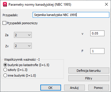 Parametry analizy sejsmicznej konstrukcji zależą od normy sejsmicznej stosowanej podczas obliczeń konstrukcji poddawanej wpływom obciążeń sejsmicznych. Wybierz kanadyjską normę sejsmiczną NBC 1995 w oknie dialogowym Definicja nowego przypadku lub kliknij Parametry w oknie dialogowym Typ analizy.