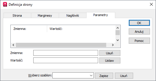 W celu określenia wartości zmiennych wybierz kartę Parametry w oknie dialogowym Układ strony.