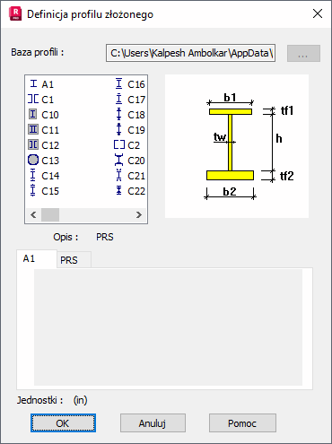 Opcja umożliwia użytkownikowi zdefiniowanie przekroju złożonego. Podając odpowiednie wymiary dla wybranego typu przekroju, w łatwy sposób można zdefiniować dość przekrój złożony.
