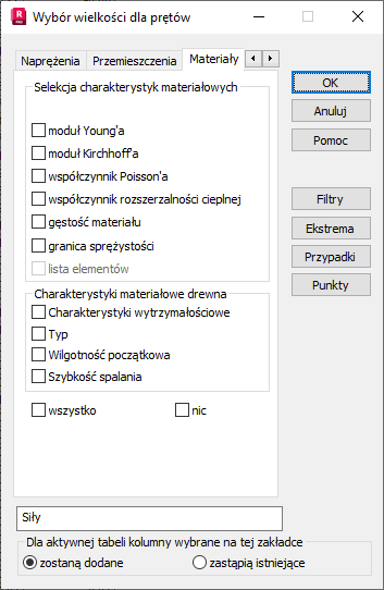 - Granica sprężystości — jeżeli ta opcja zostanie wybrana, w tabeli pojawi się kolumna, w której prezentowana będzie granica sprężystości materiału dla poszczególnych prętów konstrukcji.