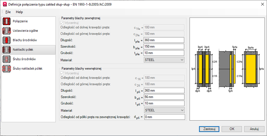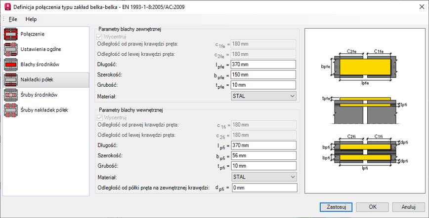 - Górne półki i Dolne półki dla połączeń belka-złącze belki