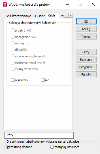 - Skrócenie absolutne dl — jeżeli ta opcja zostanie wybrana, to w tabeli pojawi się kolumna, w której przedstawiana będzie wartość dylatacji. Skrócenie jest to różnica długości cięgna w stanie nieobciążonym i odległości węzłów, pomiędzy którymi cięgno jest zamocowane.