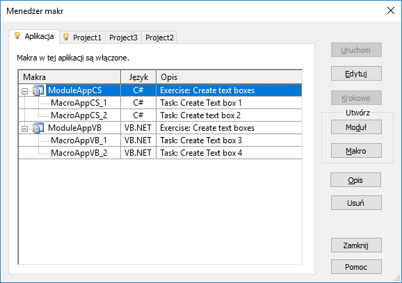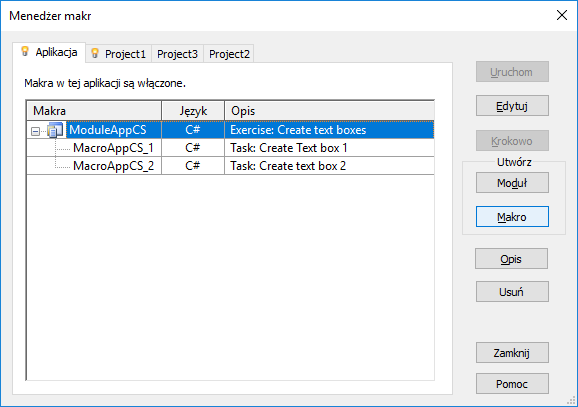 Menedżer makr służy do zarządzania makrami i uruchamiania ich.