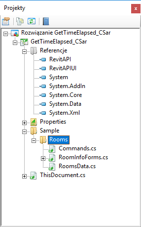 Poza środowiskiem IDE użyj Eksploratora Windows, aby przejść do folderów instalacyjnych programu Revit oraz wyszukać folder AppHookup. Zwróć uwagę, że w tym położeniu \Samples\Roomszostaną utworzone odpowiednie podfoldery.