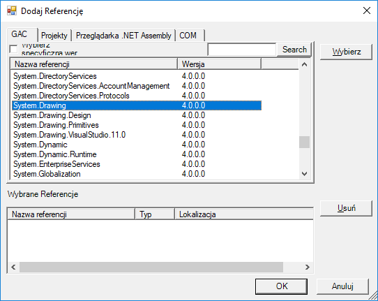 W oknie dialogowym Dodaj odniesienie znajdź i wybierz z listy System.Drawing i System.Windows.Forms. Aby wybrać wiele komponentów, przytrzymaj klawisz Ctrl. Przykładowo: