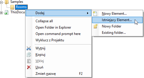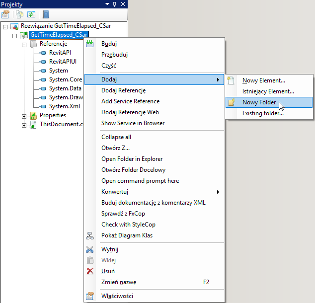 Wróć do środowiska Revit IDE. Kontynuując omawiany przykład, w Project Explorer kliknij prawym przyciskiem myszy folder utworzony dla makra i w menu kliknij kolejno opcje Add -> Existing Item.