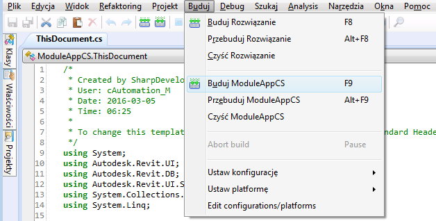 - W środowisku Revit macro IDE z listy rozwijanej wybierz opcję Build charakterystyczną dla makra.