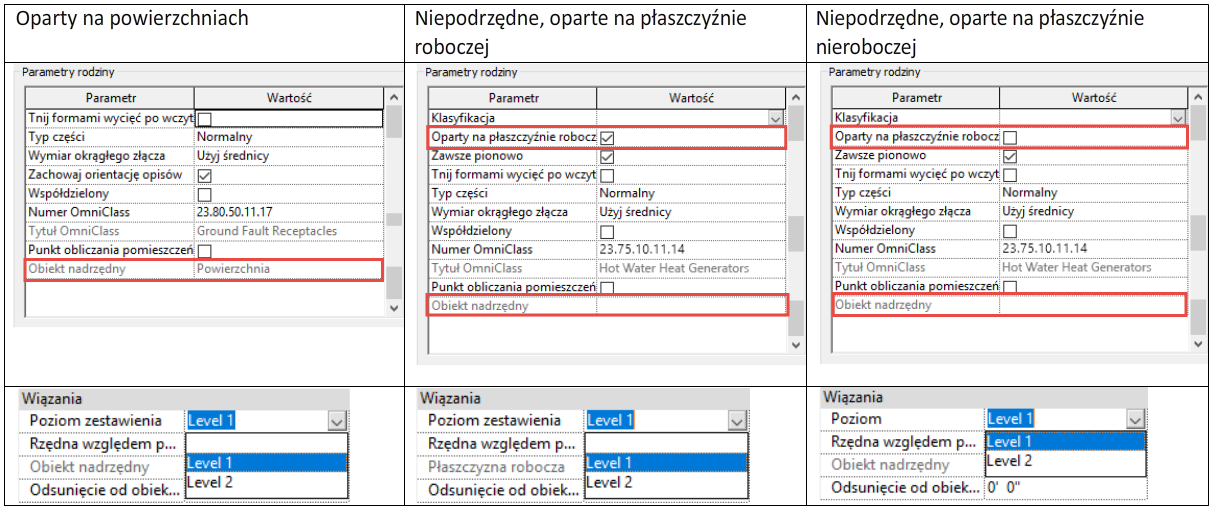 Definicja powierzchni wpływa również na to, jaka właściwość powiązana z poziomem jest dostępna. W przypadku elementów opartych na powierzchni i niepodrzędnych, opartych na płaszczyźnie roboczej istnieje wartość właściwości Poziom zestawienia. W przypadku elementów niepodrzędnych, opartych na płaszczyźnie nieroboczej nie ma właściwości Poziom zestawienia. Zamiast tego istnieje właściwość Poziom, zgodnie z podsumowaniem w następującej tabeli: