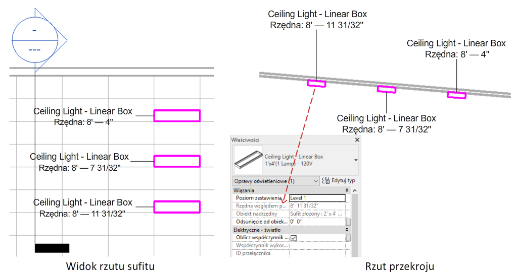 Parametru Rzędna od poziomu nie można edytować, gdy element jest umieszczony na powierzchni niepionowej, na przykład w przypadku umieszczenia gniazda w podłodze lub oprawy oświetleniowej na suficie.