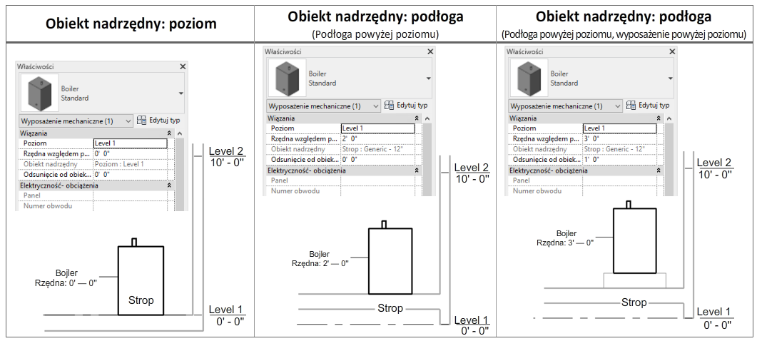 W poniższym przykładzie podłoga znajduje się na wysokości 2' 0" powyżej poziomu. Gdy bojler zostanie umieszczony na podłodze, wartość parametru Rzędna od poziomu wynosi 2' 0", a wartość parametru Odsunięcie od obiektu nadrzędnego wynosi 0' 0".