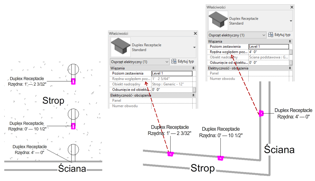 W przypadku elementów opartych na powierzchni parametr Rzędna od poziomu można edytować, gdy element jest umieszczony na powierzchni pionowej, na przykład w przypadku umieszczenia gniazda w ścianie.