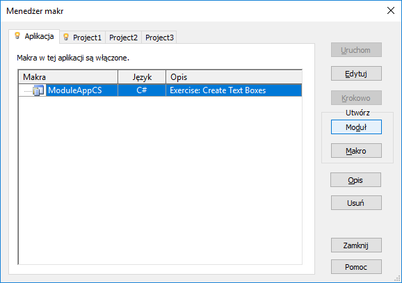 Uwaga: Jeśli aplikacja lub bieżący dokument zawiera już moduły, makra muszą być włączone w ustawieniach Bezpieczeństwo makr.