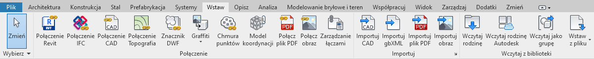 Wstążka jest wyświetlana podczas tworzenia lub otwierania pliku. Zawiera ona wszystkie narzędzia potrzebne do utworzenia projektu lub rodziny.