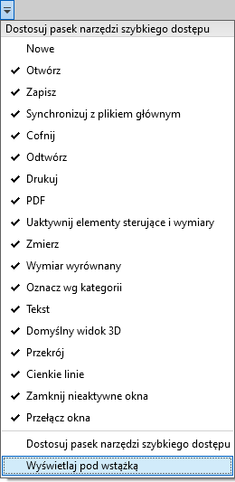 Pasek narzędzi szybkiego dostępu może być wyświetlany nad lub pod wstążką. Aby zmienić ustawienie, na pasku narzędzi Szybki dostęp kliknij kolejno listę rozwijaną Dostosuj pasek narzędzi Szybki dostęp