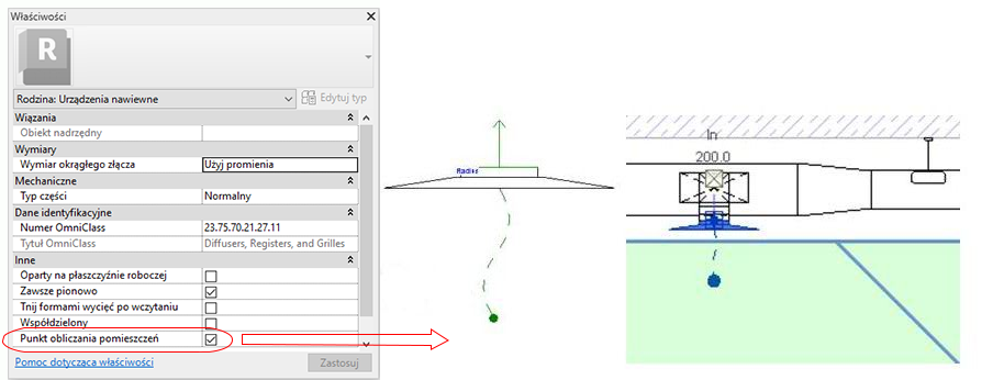 edytować rodzinę urządzeń nawiewnych, aby włączyć punkt obliczania pomieszczenia, a następnie przesunąć położenie punktu obliczania, tak aby znajdował się wewnątrz przestrzeni. W Edytorze rodzin, na palecie Właściwości, włącz punkt obliczania pomieszczenia. Edycja położenia punktu obliczania pomieszczenia, tak aby znajdował się wewnątrz przestrzeni.