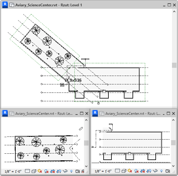 Na przykład na następującej ilustracji przedstawiono widok z góry z zakresami modelu wokół budynku głównego i skrzydła wybiegu. Zakres modelu 1 został zastosowany do osi dla budynku głównego, a zakres modelu 2 został zastosowany do osi dla skrzydła wybiegu. W wyniku tego w widokach zależnych (na dole) wyświetlane są tylko linie osi, które mają zastosowanie do każdej z części budynku.