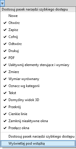Jeśli z paska narzędzi szybkiego dostępu usunięto domyślne narzędzia, można je z powrotem dodać. W tym celu należy kliknąć menu rozwijane Dostosuj pasek narzędzi szybkiego dostępu i zaznaczyć wybrane narzędzie.