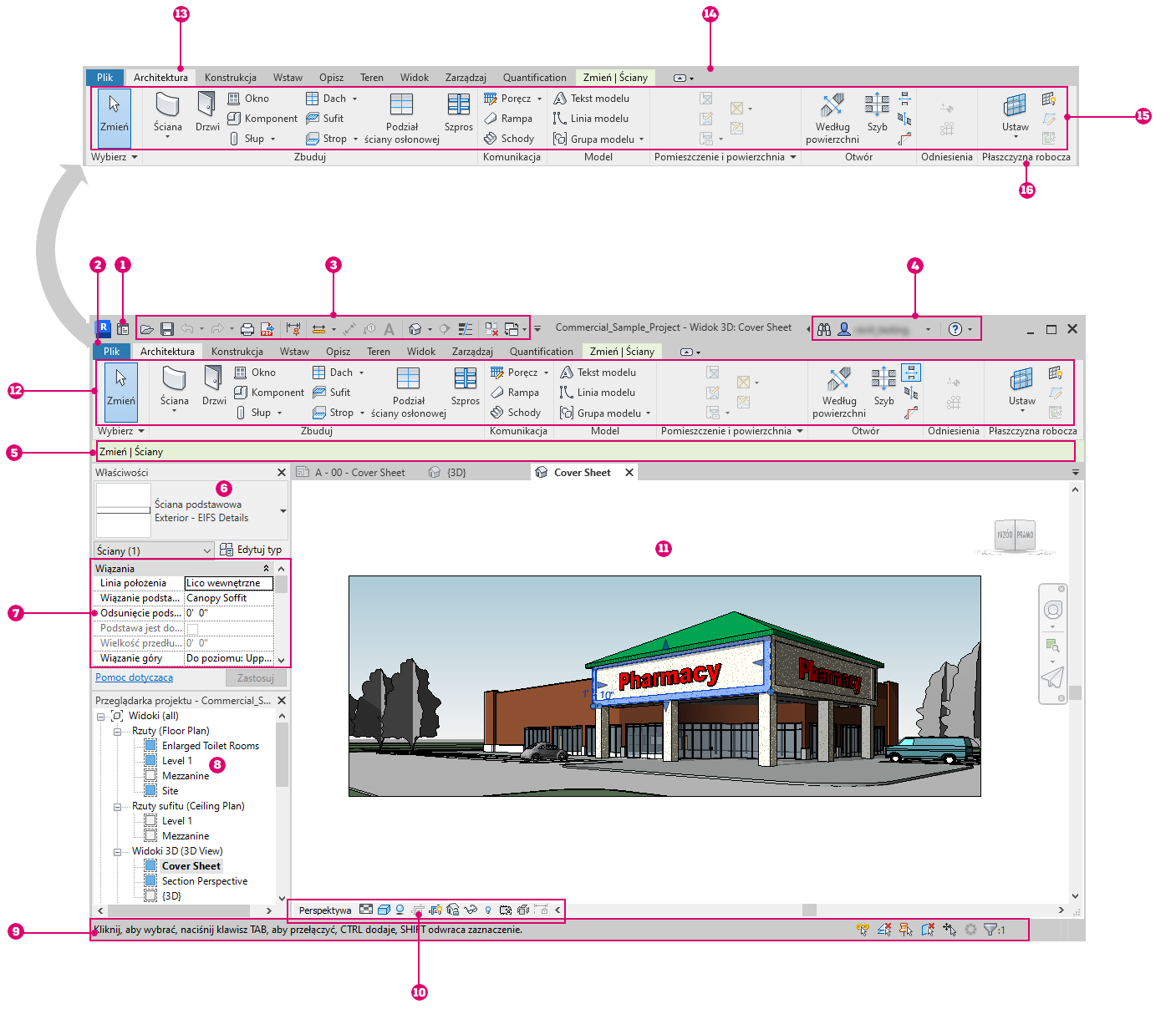 | 14 | Karta kontekstowa na wstążce, udostępniająca narzędzia odpowiednie do wybranego obiektu lub bieżącej operacji |