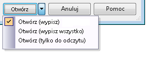 Tekst przycisku operacji można dostosować (np. Otwórz, Zapisz itp.). Ponadto do przycisku operacji można przypisać opcje wyświetlane jako menu rozwijane. Na przykład przycisk Otwórz może mieć menu rozwijane z opcjami Otwórz (wypisz), Otwórz (wypisz wszystko) i Otwórz (tylko do odczytu). ![]() |
