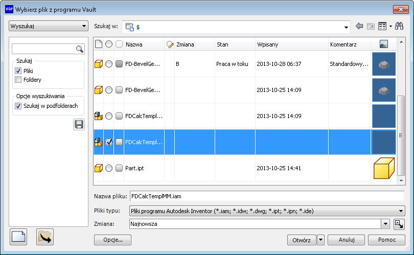 Kontrola zmian umożliwia użytkownikowi wybranie konkretnej wersji pliku dla zdarzenia wybierania elementu z programu Vault. Funkcję tę można wyłączyć. Jeśli opcja jest wyłączona, pole kombi i jego etykieta zostaną usunięte z okna dialogowego. ![]() |