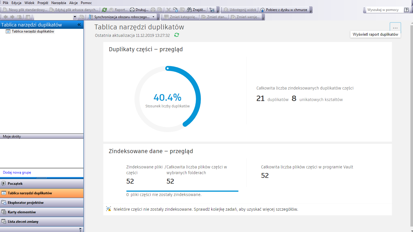 Ta tablica narzędzi służy do wyświetlania stanu zduplikowanych i zindeksowanych części.