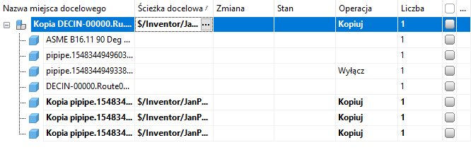 Domyślnie kopiowany jest wybrany model i wszystkie skojarzone rysunki. Kiedy opcja Widok rysunku jest włączona, tryb widoku wyświetla wszystkie skojarzone rysunki i możesz skonfigurować operację kopiowania w oparciu o rysunki. Rysunki są teraz widoczne w folderze Dokumentacja. Wyświetl je, wybierając w widoku drzewa. Uwaga: Stan Automatyczny oznacza, że działanie dla rysunku połączonego z plikiem jest takie samo, jak dla skojarzonego pliku. Przykładowo, jeśli plik jest oznaczony do skopiowania, skojarzony rysunek otrzymuje taką samą nową nazwę pliku i taką samą lokalizację podczas zdarzenia kopiowania.