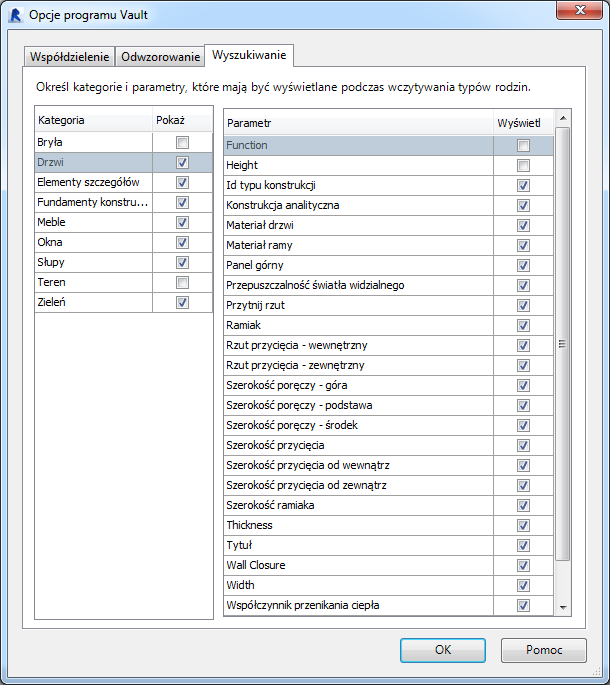 Konfigurując ustawienia na karcie Wyszukiwanie w oknie dialogowym Opcje programu Vault, można określić, które kategorie i parametry mają być wyświetlane w wyszukiwaniach w lewym panelu okna dialogowego Wczytaj rodzinę.