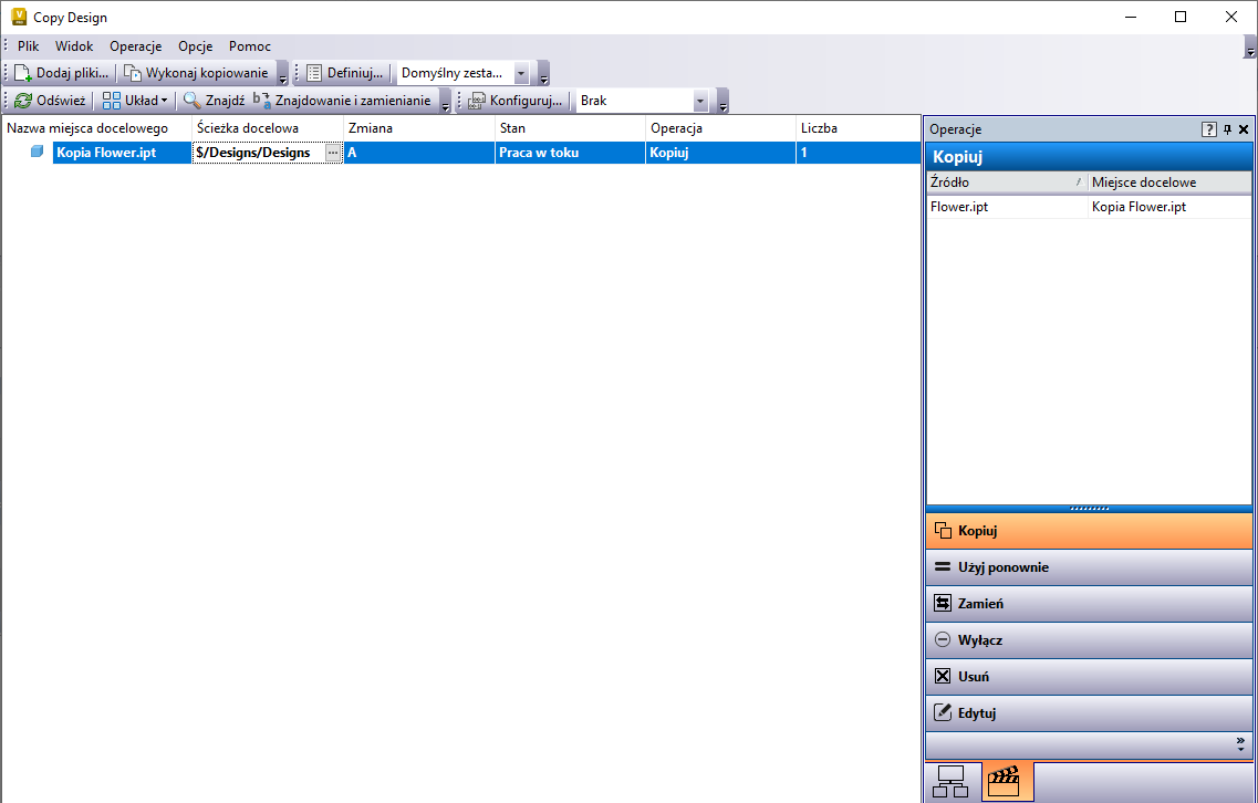 Polecenie Kopiuj konstrukcję tworzy kopię projektu o tej samej strukturze, co pliki źródłowe. W oknie dialogowym Copy Design można wybrać części istniejącego projektu do skopiowania, ponownego użycia, ponownego użycia gałęzi, zamiany, wykluczenia lub odłączenia.