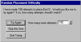 Essa caixa de diálogo é exibida quando o Character Studio enfrenta dificuldades em posicionar objetos clonados sem causar uma sobreposição usando a caixa de diálogo Dispersar objetos. O texto da caixa de diálogo indica o número de tentativas que o Character Studio fez para posicionar um objeto específico e pergunta se você deseja tentar novamente.