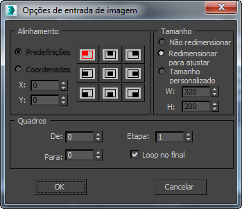 A caixa de diálogo Opções de entrada de imagem contém controles para definir o tamanho e a posição da imagem em relação aos quadros de saída de vídeo. Para entrada com animação, também é possível utilizar essa caixa de diálogo para sincronizar o evento Entrada de imagem com a sequência de quadros da saída de vídeo. A mesma caixa de diálogo aparece quando você clica em Opções, na área Máscara das caixas de diálogo Evento de filtro e Evento de camada.