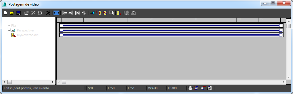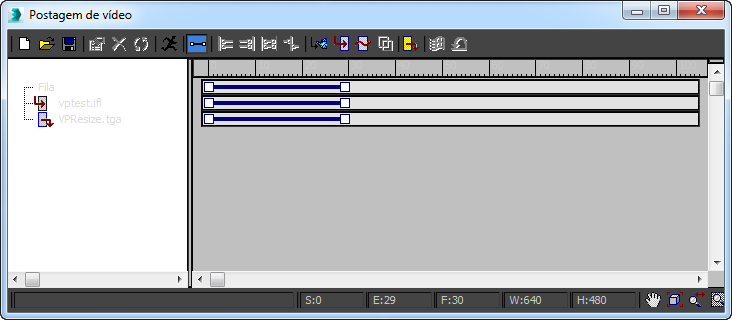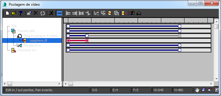 Observe que, neste exemplo, o evento de entrada de imagem contém somente dez quadros. Normalmente, você escolheria um conjunto de imagens de plano de fundo que é igual ao número de quadros da cena. Quando essa sequência é executada tal como está, as imagens no arquivo IFL aparecem apenas para os primeiros dez quadros e, em seguida, desaparecem.