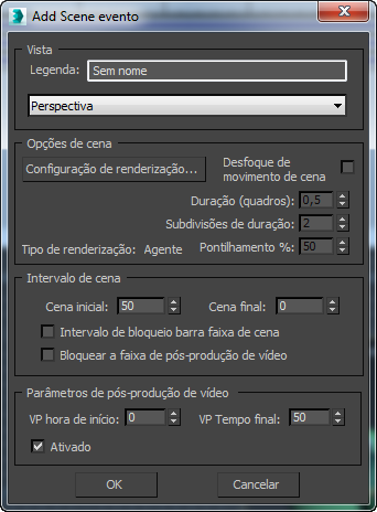 Clique em Add Scene evento e defina a vista Perspectiva ou uma Câmera existente na cena. Clique em OK para fechar a caixa de diálogo Add Scene evento.