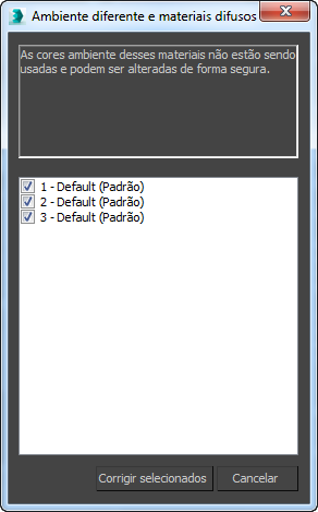 O utilitário Corrigir ambiente procura materiais padrão na cena no momento cujas cores ambiente e difusas são diferentes, apresentando a você a opção de copiar a cor difusa no canal da cor ambiente. Isso garantirá que as suas renderizações sejam consistentes com as versões anteriores dos produtos.