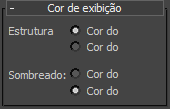 A caixa de expansão Cor de exibição especifica se o 3ds Max exibe os objetos usando suas cores de estrutura de arame (também conhecidas como cores do objeto) ou suas cores de materiais difusas, quando os objetos tiverem suas propriedades de exibição definidas como Por objeto.