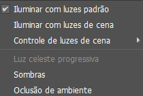 Mostra um submenu com opções para visualizações de iluminação e sombra.