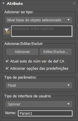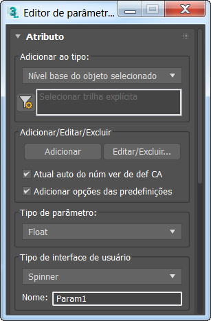 Nota: Se você escolher o Modificador atual do objeto selecionado e se vários modificadores estiverem realçados na pilha quando você clicar em Adicionar, o Editor de parâmetros aplicará o atributo personalizado ao primeiro modificador realçado e removerá o realce dos outros modificadores.