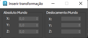 Quando esta opção estiver desativada, o 3ds Max trata os valores inseridos nos campos X, Y e Z como absolutos. Quando esta opção estiver ativada, o 3ds Max aplica os valores de transformação que você inserir como relativos aos valores atuais; isto é, como um deslocamento. Padrão=desativado.