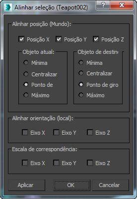Essa opção é independente das configurações de alinhamento da posição. Você pode deixar as configurações de Posição e usar as caixas de seleção de Orientação para rodar o objeto atual para coincidir com a orientação do objeto alvo.