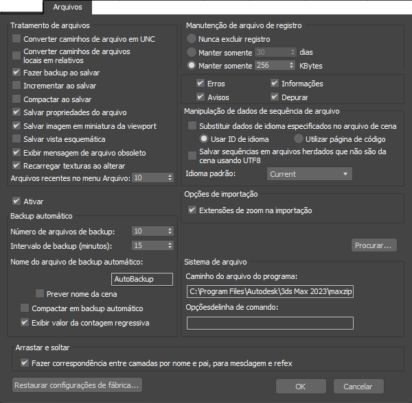 - Quando ativado, o arquivo de backup automático é compactado. Isso pode economizar espaço no trabalho com cenas muito grandes, pois um arquivo compactado pode ter até um quinto do tamanho do seu equivalente não compactado, embora possa levar mais tempo para ser carregado.