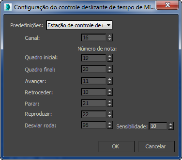 Com a Caixa de diálogo Configuração de controle deslizante de tempo de MIDI é possível especificar e configurar um dispositivo MIDI para controlar a reprodução da animação.