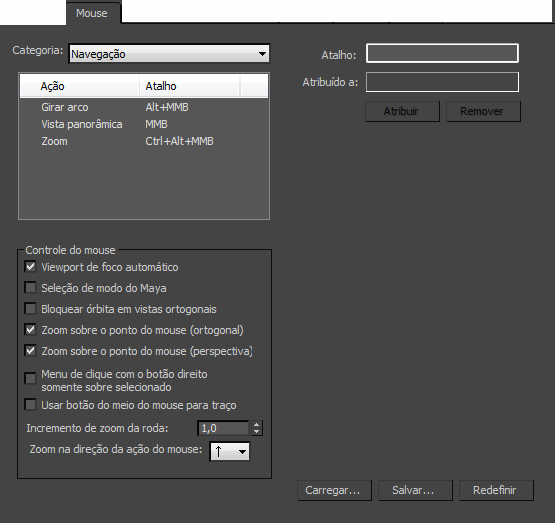 Importante: As configurações do mouse que afetam Aplicar zoom e Efetuar panorâmica no modo 3ds Max versus o modo Maya (três configurações de atalhos e a direção Aumentar zoom) também afetam o Windows na Vista de trilha, o Motion Mixer, o Fluxo de movimento, a caixa de diálogo Editar UVWs e a barra de trilha expandida ("Editor de minicurva").