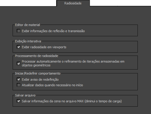 No painel Radiosidade da caixa de diálogo Configurações de preferência, é possível definir opções para a solução de radiosidade.