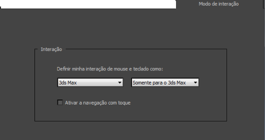 - 3ds Max (O padrão). Mouse e atalhos de teclado se comportam da maneira "tradicional" do 3ds Max.