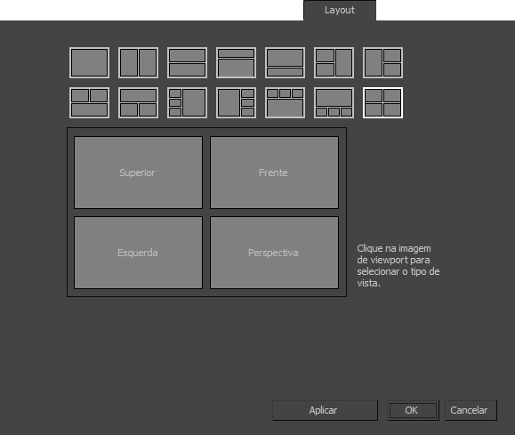 Especifique o método de divisão de viewports e atribua tipos específicos de visualizações para cada viewport no painel Layout da caixa de diálogo Configuração da Viewport.